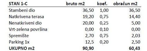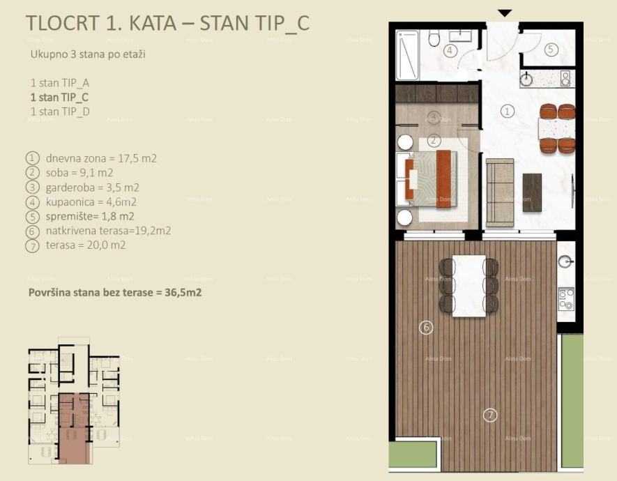 Ta čudovit apartma, Tip C, se nahaja v 1. nadstropju stavbe B in vključuje dnevno sobo, kuhinjo in jedilnico z dostopom do terase, spalnico, kopalnico, garderobo in shrambo.