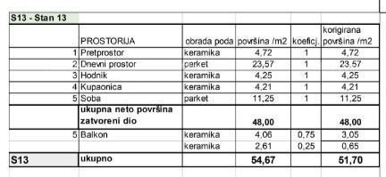 Stanovanje S13, ki se nahaja v 1. nadstropju stavbe, površine 54,67 m2 (51,7 m2).