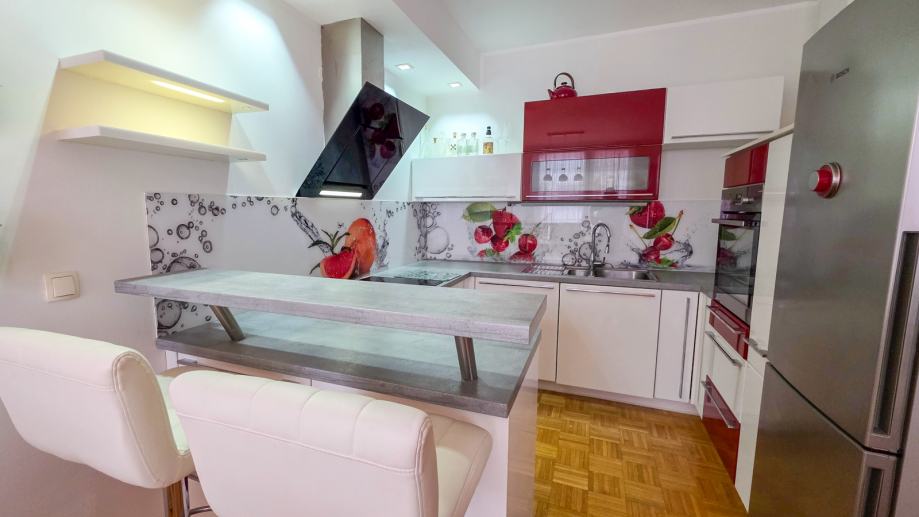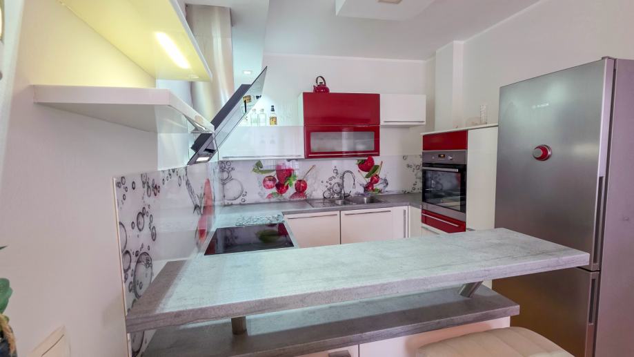 kuhinja z vsemi aparati (indukcija, pečica, pomivalni stroj, samostoječi hladilnik, napa