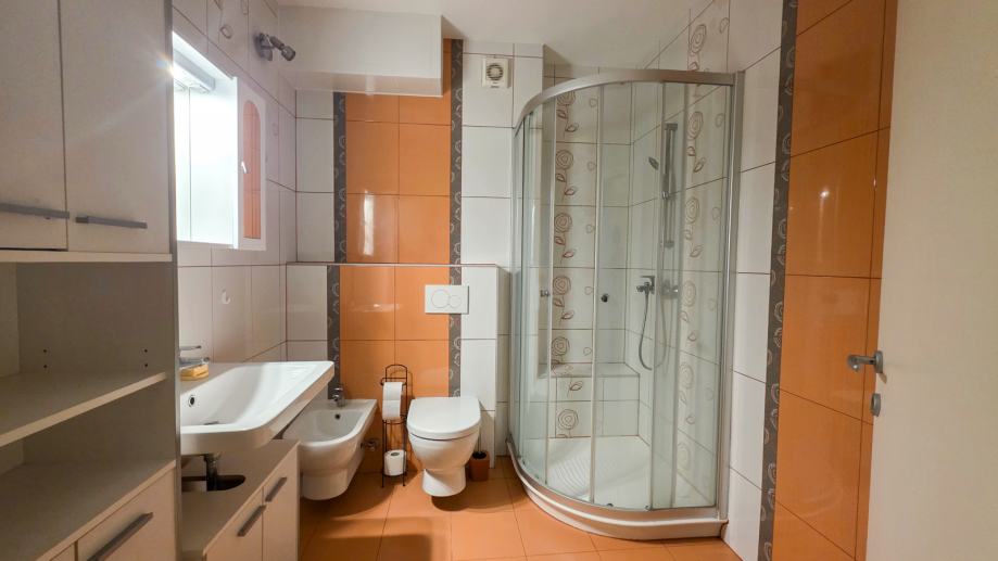 kopalnica z WC-jem, bidejem ter tušem in kopalniškim blokom z umivalnikom in armaturo