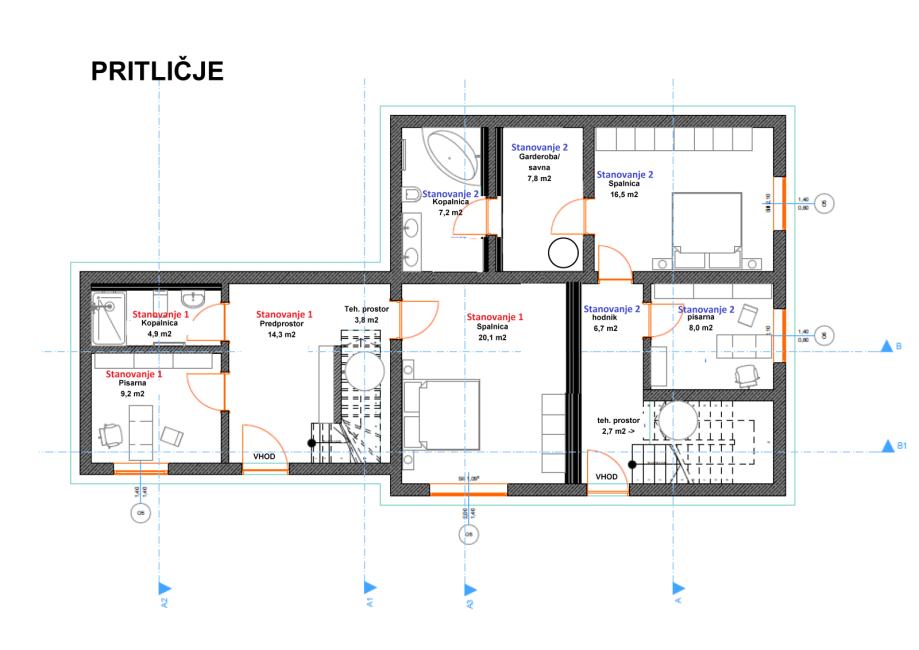 Predmet oglasa je levo stanovanje (v pripetem tlorisu stanovanje 1) z 176,1 m2 uporabne površine (po GURS odločbi o vpisu) s pripadajočim atrijem in zemljiščem v velikosti 582 m2. Hiša se razprostira v treh etažah, kjer je vsak prostor zasnovan premišljeno za udobno bivanje.