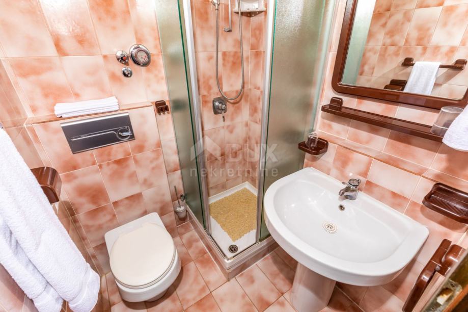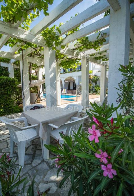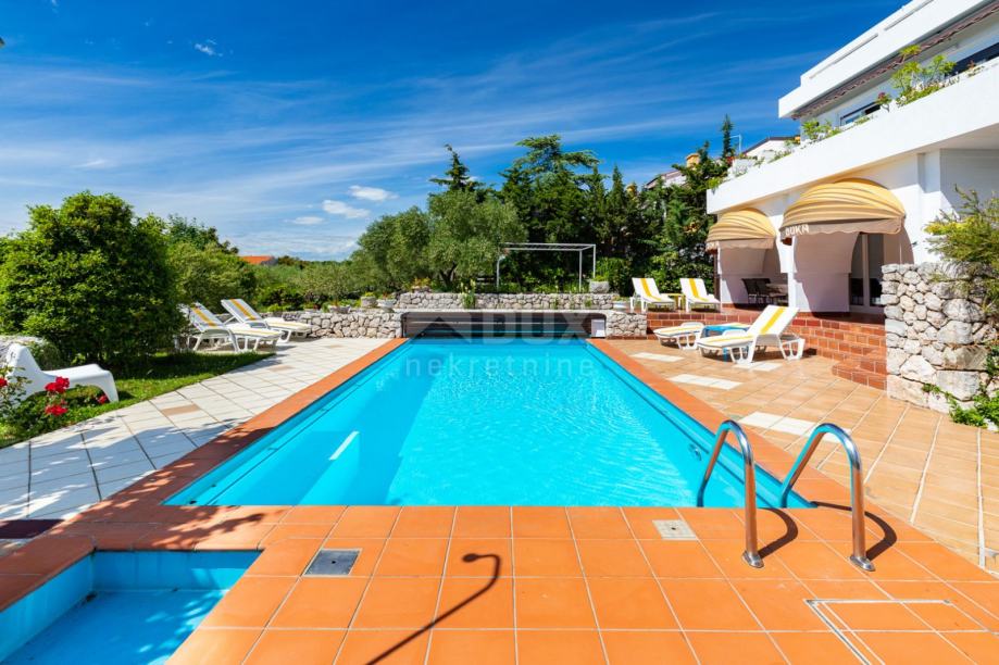 Otok Krk, Punat - Apartmajska hiša prva vrsta do morja in lepih plaž, s pogledom na morje iz vseh apartmajev. Hiša je polna potenciala, edinstvenega videza, skupne površine 500 m2, ima sedem stanovanj in se razprostira na lepo urejenem vrtu velikosti 1500 m2. V pritličju se nahaja restavracija in savna za uporabo gostov. Hiša ima dva vhoda, enega stanovanjskega in drugega samo za stanovanja. Apartmaji se nahajajo takole: V pritličju stanovanje velikosti 45m2, z dvema spalnicama, kopalnico in kuhinjo z jedilnico. V medetaži je manjša enota 35m2 z dvema spalnicama, kopalnico, kuhinjo in dvema terasama. V prvem nadstropju se nahajata dve stanovanjski enoti, eno stanovanje s tremi spalnicami, kuhinjo, dnevno sobo, dvema kopalnicama, več terasami in še eno stanovanje 45m2, z dvema spalnicama, kopalnico, wc-jem, kuhinjo in jedilnico ter teraso. V medetaži do drugega nadstropja se nahaja večje stanovanje 65m2 z dvema spalnicama, ki imata svojo galerijo, kuhinjo in dnevno sobo, kopalnico in dve lepi terasi. V drugem nadstropju se nahaja ena manjša garsonjera in eno stanovanje 40m2, s kuhinjo in jedilnico, kopalnico in spalnico. Na lepo urejenem vrtu so bazen, sončna terasa, žar, kegljišče in 8 parkirnih mest, od tega 6 pokritih. Hiša se nahaja na odlični lokaciji, le 20 m oddaljena od morja in lepih peščenih plaž. Odlična priložnost za investicijo, tako zaradi svoje lokacije kot zaradi utečene najemne dejavnosti.