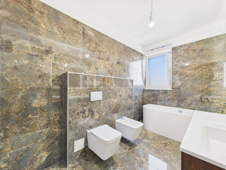 Kakovost gradnje in opreme je vidna v vsakem detajlu – talno ogrevanje s toplotno črpalko Vaillant omogoča prijetno temperaturo in energetsko učinkovitost skozi vse leto, klimatski sistem pa prispeva k dodatnemu udobju. Sanitarna oprema in zaključna obdelava so izvedeni z mislijo na estetiko in dolgotrajnost, kar zadostuje najvišjim bivalnim standardom.