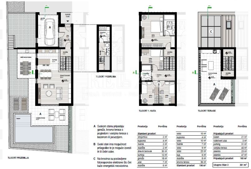Prodamo luksuzno stanovanje v novogradnji v Kostreni, natančneje v Sveti Luciji, katerega površina obsega 196 m2 bivalne površine in 165 m2 zunanje površine. Stanovanje se razteza v treh etažah: klet, pritličje in nadstropje. V pritličju se nahaja prostorna dnevna soba, kuhinja in atraktivna zunanja terasa z bazenom. V kleti je kopalnica in kurilnica. V prvem nadstropju so štiri spalnice in dodatna kopalnica. Iz prvega nadstropja je možen dostop do strešne terase z neverjetnim panoramskim pogledom na morje. Stanovanje je opremljeno s talnim gretjem, ventilatorskim konvektorjem in toplotno črpalko. Stranke lahko svobodno izbirajo zaključne materiale glede na lastne želje. Na strehi so nameščene fotovoltaične elektrarne, ki hišo naredijo energetsko neodvisno. Objekt se nahaja v priljubljenem delu Kostrene, znanem kot "Zelena Kostrena", le 5 minut vožnje do prve plaže. Dostop do objekta je zagotovljen z zgornje ceste, kjer je predvidena širitev obstoječe ceste. Stanovanju pripadata dve zunanji parkirni mesti in garaža v stavbi. Za vse dodatne informacije o tej izjemni ponudbi nas kontaktirajte.