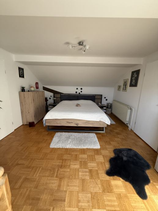Iz pritličja se po lesenih stopnicah povzpnemo v zgornje nadstropje, kjer se nahajata dve prostorni spalnici, ena izmed njiju pa ima izhod na balkon, ki omogoča prijeten razgled in svež zrak. Poleg spalnic je tudi garderobna soba s pohištvom po meri, ki nudi dovolj prostora za urejeno shranjevanje oblačil in drugih stvari.
