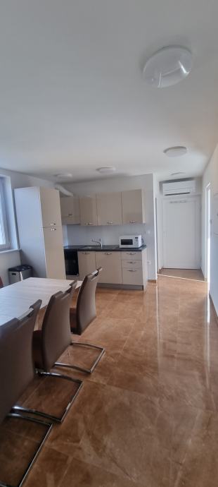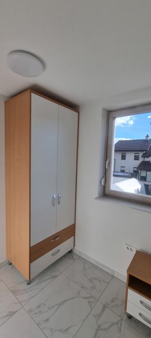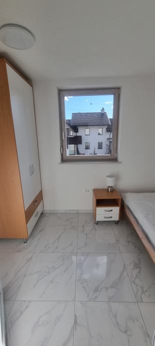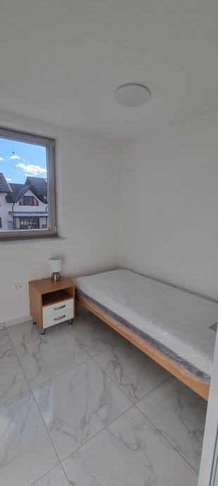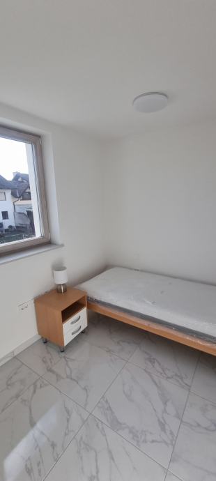 V novogradnji oddam enopostelno sobo, 9 m2, v stanovanju, v 1. nadstropju. Neto površine celega stanovanja je 68m2, ima kopalnico z wc-jem, dodatni wc, enoposteljno sobo, dve dvoposteljni sobi, jedilnico in kuhinjo. Stanovanje ima 5 parkirnih mest, zunaj ima na voljo 20 m2 za preživljanje prostega časa na prostem. Stanovanje je popolnoma opremljeno, ima kabelsko tv, EON, internet in televizijski sprejemnik Sony. Ogrevanje je talno, plinsko, dodatno še električno, hlajenje z klimatsko napravo. Kuhinja je opremljena z hladilnikom, zamrzovalnik, plinsko – električna kuhalna plošča, električna pečica, mikrovalovna pečica.