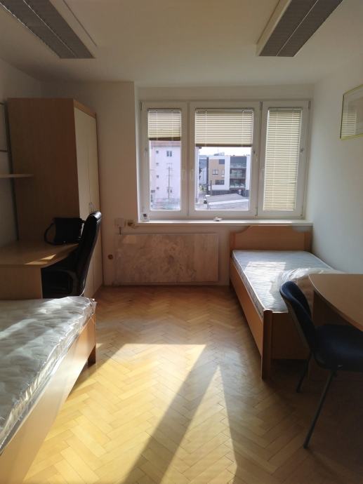 Bivalni prostor je opremljen z dvema posteljama s posteljnino , dvema omarama in dvema delovnima mizama.