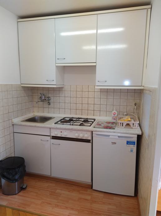 Kuhinjo s kombiniranim plinsko_električnim štedilnikom , hladilnikom , kombiniranim pralno sušilnim strojem , pomivalnim koritom , z elementi za odlaganje posode ter jedilni kot za dve osebi.