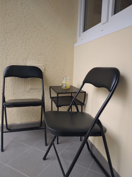 SKUPNI PROSTORI: lepo in dobro opremljeni – kuhinja (plinsko in električno kuhališče, pečica, hladilnik in zmrzovalnik, pomivalni stroj, opekač za sendviče, mikrovalovna pečica, lonček za gretje vode), miza in 4 stoli, fotelji in TV, kopalnica (tuš, pralni stroj, sušilec za lase), ločen wc, udoben balkon (miza in 2 stola, sušilo za perilo), hodnik (omarica za čevlje, obešalna stena za garderobo, ogledalo), utility kotiček (sesalec za prah, likalna miza, likalnik…).