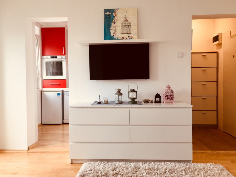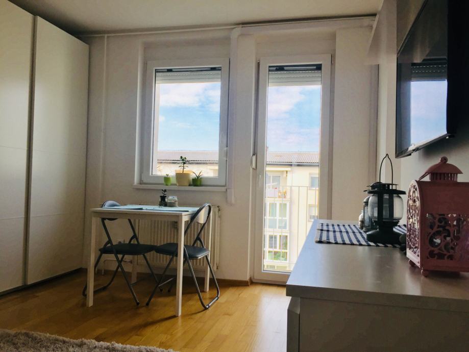 Oddamo garsonjero (25m2) v Ljubljani - Trnovsko predmestje (Cesta v Mestni log). Sončno in svetlo stanovanje (obrnjeno na južno stran) je v 3./3 nadstropju z balkončkom na park. Stanovanje je sestavljeno iz sobe, majhne kuhinje, hodnika in kopalnice. Je v celoti opremljeno: kavč z ležiščem 140x200, TV, pralni, pomivalni in sušilni stroj, klima, hladilnik, štedilnik in pečica, na vseh oknih so komarniki in rolete. K stanovanju spada tudi kolesarnica in klet ter parkirišča, ki so pred vhodom in okoli bloka. Je v bližini trgovine Mercator, zraven Osnovne šole Kolezija. Stanovanje v celoti obnovljeno, ima nova okna, možnost brezžičnega interneta preko optičnega kabla. Blok ima obnovljeno fasado, streho in svojo lastno kurilnico. Vseljivo od 1.6. 2025.