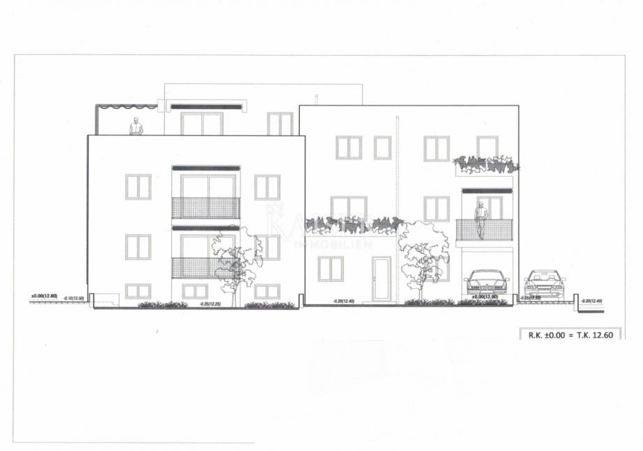 NOVOGRADNJA – Apartmaji in poslovni prostori v Kaštel Sućurcu, 300 m od morja. Apartmaji in poslovni prostori so naprodaj v novi, manjši stanovanjski stavbi v gradnji, ki se nahaja v mirni ulici v Kaštel Sućurcu. Lokacija je odlična – v neposredni bližini centra mesta, le 300 metrov od morja, in v območju načrtovanega novega infrastrukturnega projekta – mostu, ki naj bi v prihodnosti povezal Kaštelo in Split, kar bi še povečalo vrednost te lokacije. Stavba je idealna za mirno družinsko življenje ali pametno naložbo. Sestavljena je iz skupno štirih apartmajev, dveh manjših stanovanjskih enot/poslovnih prostorov (garsonjer), shrambe in zunanjih parkirnih mest. Apartmaji: Apartma S1 (pritličje, 65,46 m²) ponuja zelo funkcionalno razporeditev prostorov: predsoba, prostorna kuhinja z jedilnico, velika dnevna soba, dve spalnici, kopalnica in dodatno stranišče ter loža. To stanovanje je odlična izbira za družino z otroki. Cena: 229.110 evrov Stanovanje S2 - prodano Stanovanje S3 se nahaja v prvem nadstropju moderne stanovanjske stavbe, s skupno površino 65,46 m². Ob vstopu v stanovanje vstopite v hodnik velikosti 2,83 m², ki je osrednja točka, iz katere se naravno vstopa v vse ostale prostore. Odprt bivalni prostor sestavljata kuhinja z jedilnico, ki meri 12,31 m², in prijetna ter prostorna dnevna soba, velika 18,15 m², idealna za druženje in sprostitev. Iz bivalnega prostora se odpre loža velikosti 5,78 m² (preračunano 4,33 m²), ki zagotavlja miren kotiček za uživanje, zaradi dvignjene lege pa ponuja tudi delni pogled na morje. Stanovanje ima dve spalnici - ena, ki meri 12,24 m², je primerna kot glavna spalnica, druga, ki meri 9,28 m², pa je idealna za otroško, delovno sobo ali sobo za goste. Poleg tega ima stanovanje prostorno kopalnico velikosti 4,50 m² in dodatno ločeno stranišče velikosti 1,82 m², kar je velika prednost v vsakdanjem življenju - še posebej za veliko družino ali ko imate goste. Stanovanje je izjemno funkcionalno, z jasno ločenim bivalnim in spalnim delom, zračno in polno svetlobe ter popolno kombinacijo sodobne razporeditve in udobja. Cena 229.110 evrov. Stanovanje S4 (dvonadstropno, 91,33 m²) je največja enota v stavbi. Razteza se čez dve nadstropji in vključuje tri spalnice, dve kopalnici, veliko dnevno sobo, kuhinjo z jedilnico, hodnik, notranje stopnišče in dve terasi. Idealno za večjo družino, ki ji je pomemben prostor in zasebnost. Cena 319.655 evrov Poslovni prostori / garsonjere: PP1 (17,09 m²) je sestavljen iz ene sobe in kopalnice. Primerno je za pisarno, garsonjero ali kot najemniško stanovanje. Cena 59.815 evrov PP2 (18,85 m²) ima ločen vhod in lasten vrt. Sestavljen je iz ene sobe, kopalnice in vrta velikosti 34 m² (preračunano 3,45 m²). Obstaja možnost združitve obeh prostorov v eno večjo enoto. Cena 65.975 evrov Dodatno: Za vsako stanovanje je potreben nakup kletne shrambe (preračunano 2–5 m²) in zunanjega parkirnega mesta. Plačilo možno po fazah gradnje. Zaključek del predviden poleti 2026. Agencijska provizija za kupca znaša 3 % in se plača v primeru nakupa nepremičnine, ob sklenitvi prvega pravnega dejanja. Za več informacij in za dogovor o ogledu nas kontaktirajte z zaupanjem. Tel.: +385915404646 E-pošta: vedran@kaiser-immobilien.hr