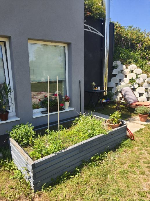 Pred hišo je terasa, visoka gredica za ljubitelje vrtičkanja in velik del zelenice.