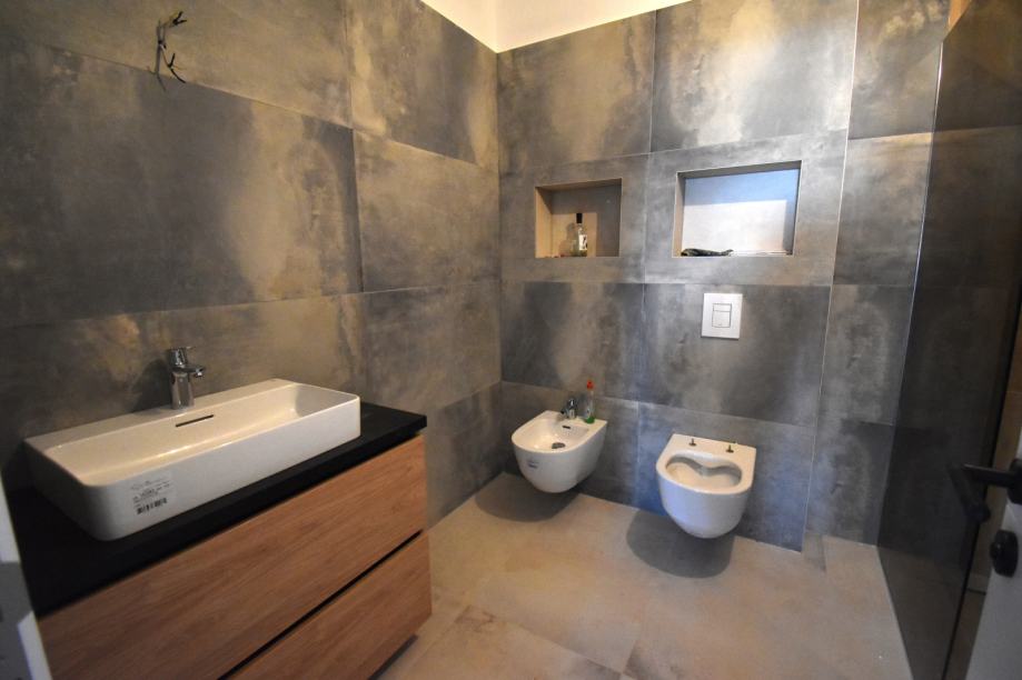 Ta prostoren stan, s premišljenim tlorisom, se razteza na 100 m2 in vključuje kuhinjo z jedilnico in dnevnim prostorom, ki ima izhod na teraso, hodnik, 3 spalnice, od katerih ima ena lastno kopalnico, ter še dve dodatni kopalnici.