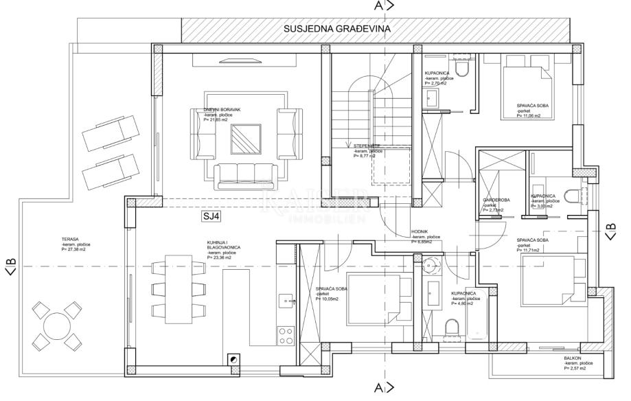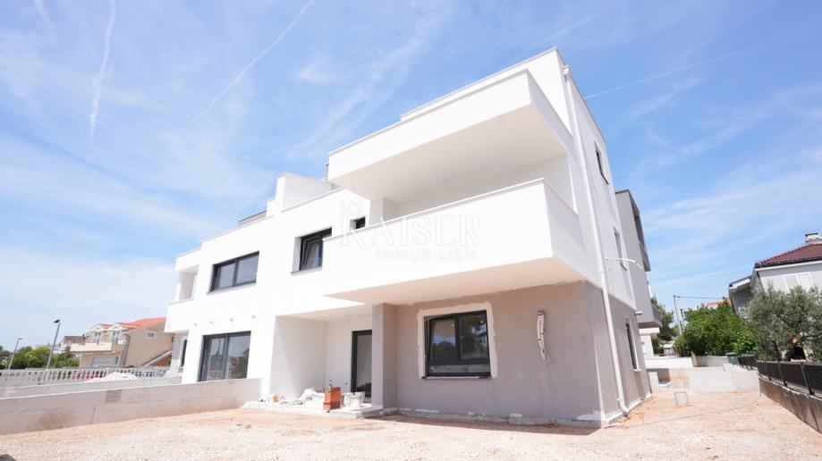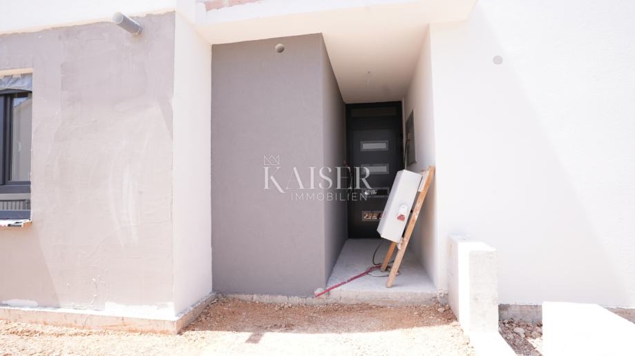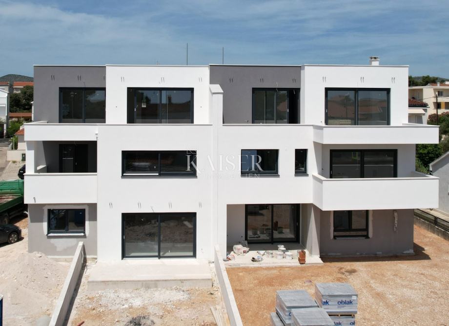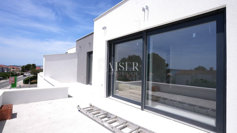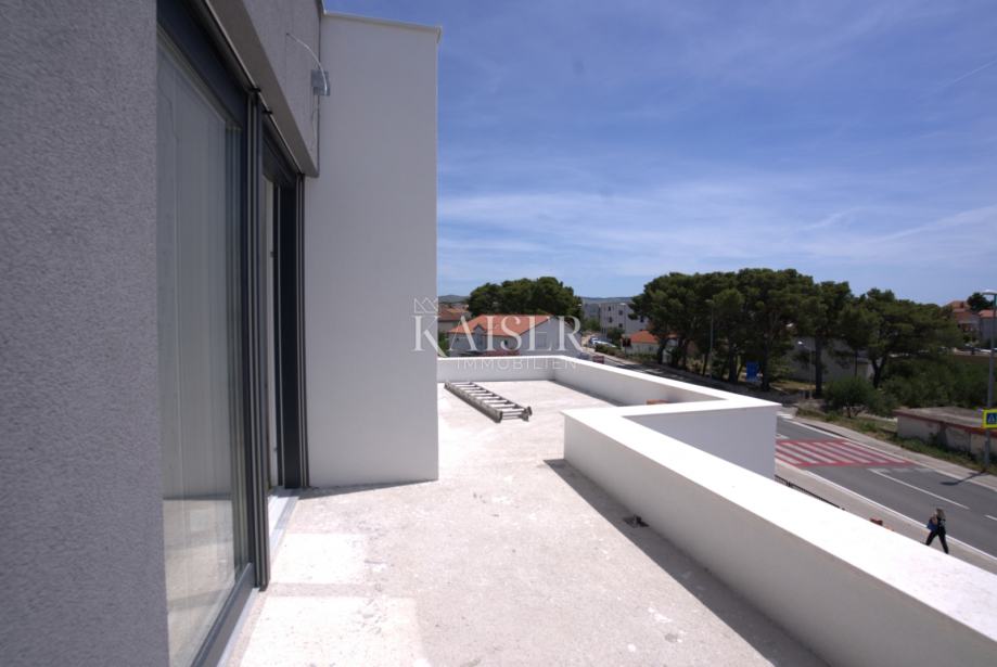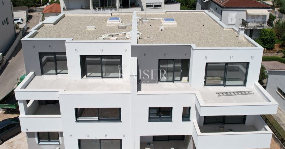 Brodarica – Luksuzni penthouse 98 m² s prostorno teraso 27 m² in odprtim pogledom na morje. Brodarica je mirna in privlačna vasica južno od Šibenika, znana po kristalno čistem morju, urejenih plažah in razgledu na šibenski arhipelag. Zaradi odličnih prometnih povezav (blizu avtoceste A1 in letališča Split) in neposredne bližine Narodnega parka Krka je Brodarica vse bolj priljubljena destinacija tako za družinsko življenje kot za naložbe v turizem. Naprodaj je penthouse s skupno neto površino 98 m², ki se nahaja v drugem nadstropju urbane vile s skupno šestimi stanovanjskimi enotami. Stanovanju pripada tudi prostorna terasa 27 m² s panoramskim razgledom na morje in okoliške otoke – idealno za sprostitev in druženje na prostem. Stanovanje obsega: prostorno dnevno sobo s kuhinjo in jedilnico (45,21 m²), tri spalnice (10,05 m², 11,71 m² in 11,06 m²), tri kopalnice z WC-jem (3,03 m², 2,70 m² in 4,80 m²), garderobno sobo (2,73 m²), balkon (2,57 m²), hodnik (6,85 m²), teraso (27,00 m²). Stanovanju pripadata dve zunanji parkirni mesti velikosti 12,50 m² in 16,06 m2, ki se nahajata pred stavbo. Nepremičnina se prodaja v nedokončani fazi, kar kupcu omogoča samostojno izbiro zaključnih materialov in opreme. Cena vključuje: Pripravo za talno ogrevanje v vseh prostorih (brez toplotne črpalke), Pripravo za klimatsko napravo v vseh spalnicah, Vgrajeno klimatsko napravo v dnevni sobi, Možnost izbire keramike, Možnost izbire kopalniške opreme do vrednosti 1.500 € na kopalnico. Stavba je zgrajena s kakovostnimi materiali: 10 cm debela termo fasada, betonska streha s toplotno izolacijo, PVC stavbno pohištvo z roletami in komarniki. Dvorišče stavbe je ograjeno, vhodna vrata pa so protivlomna. Lokacija v mirni ulici zagotavlja zasebnost in tišino. Bližina ugodnih storitev: Plaža – 150 m Restavracija – 500 m Trgovina – 5 m Center Šibenika – 6 km Narodni park Krka – 16 km Avtocesta A1 – 8 km Letališče Split – 55 km Oddaljenost od večjih mest: Zagreb – 340 km Split – 80 km Zadar – 95 km Reka – 270 km Ljubljana – 390 km Dunaj – 680 km München – 790 km Ta penthouse predstavlja odlično priložnost za tiste, ki si želijo moderno stanovanje v mirnem okolju z odprtim pogledom na morje, z možnostjo opremljanja notranjosti po lastnih željah, pa tudi za investicijo v turistični najem. Provizija agencije za kupca znaša 3 % + DDV in se plača v primeru nakupa nepremičnine, ob sklenitvi prve pravne listine. Ogled nepremičnine je možen le ob predhodnem podpisu pogodbe o posredovanju pri prometu z nepremičninami. Če si želite nepremičnino ogledati osebno, se obrnite na: Joška Bašića E-pošta: josko@kaiser-immobilien.hr Tel: +385-91-511-2693 http://kaiser-immobilien.hr/