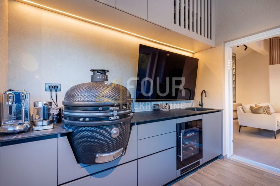 Stanovanje je površine 97,45 m² (neto 94,78 m²) in obsega odprt prostor, v katerem so dnevna soba, kuhinja in jedilnica, dve spalnici, dve kopalnici ter velika zastekljena loža z letno kuhinjo.