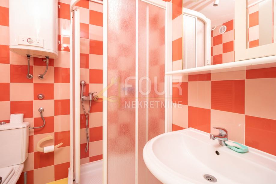 V kleti, ki zaradi konfiguracije terena funkcionira kot pritličje, se nahaja enosobno stanovanje površine 34,44 m² z izhodom na prostorno dvorišče z vrtom površine 124,77 m² in odkrito teraso površine 25,84 m², ki ima direkten dostop do plaže.