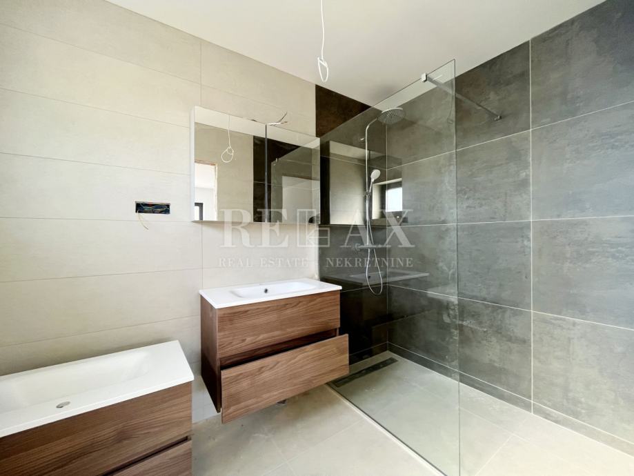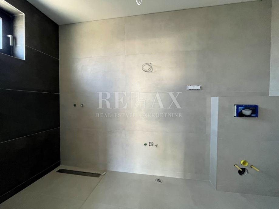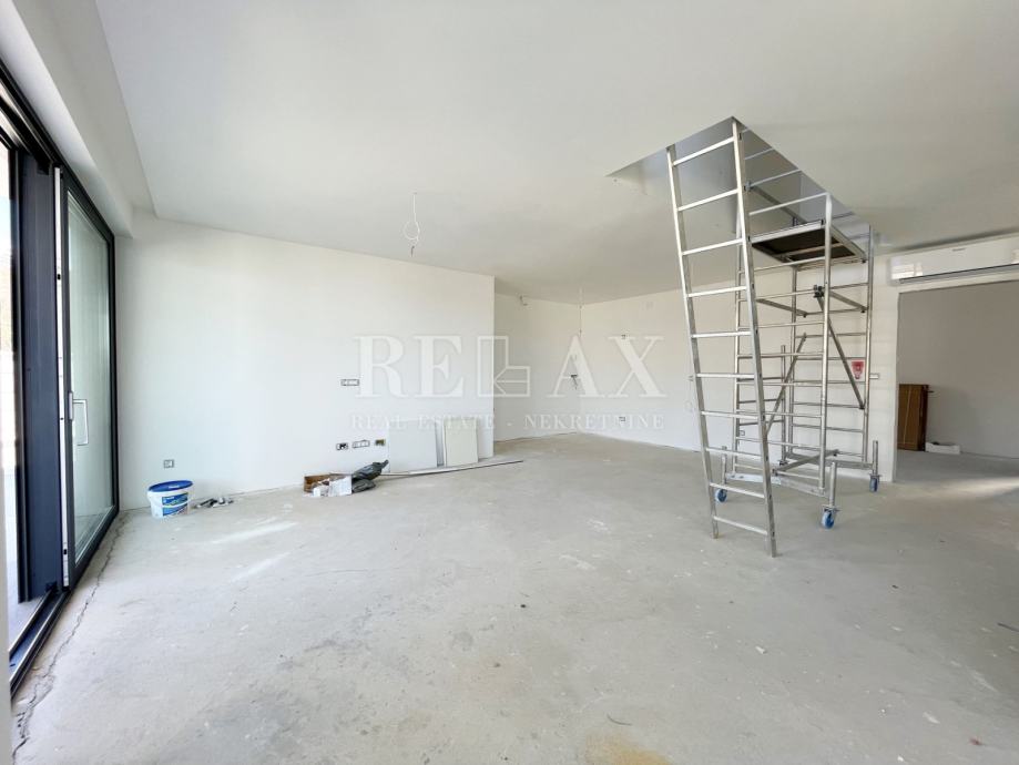 Prostorno stanovanje, ki se razprostira v dveh nadstropjih, je sestavljeno iz spalnice z lastno kopalnico, WC-ja, odprte kuhinje z dnevno sobo, iz katere se izhod na balkon, kjer se nahaja bazen s prostorom za sončenje in tuš.