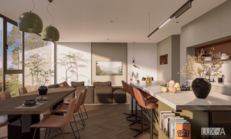 - prostoren dnevno-bivalni prostor s kuhinjo in jedilnico z izhodom na pokrito teraso,
