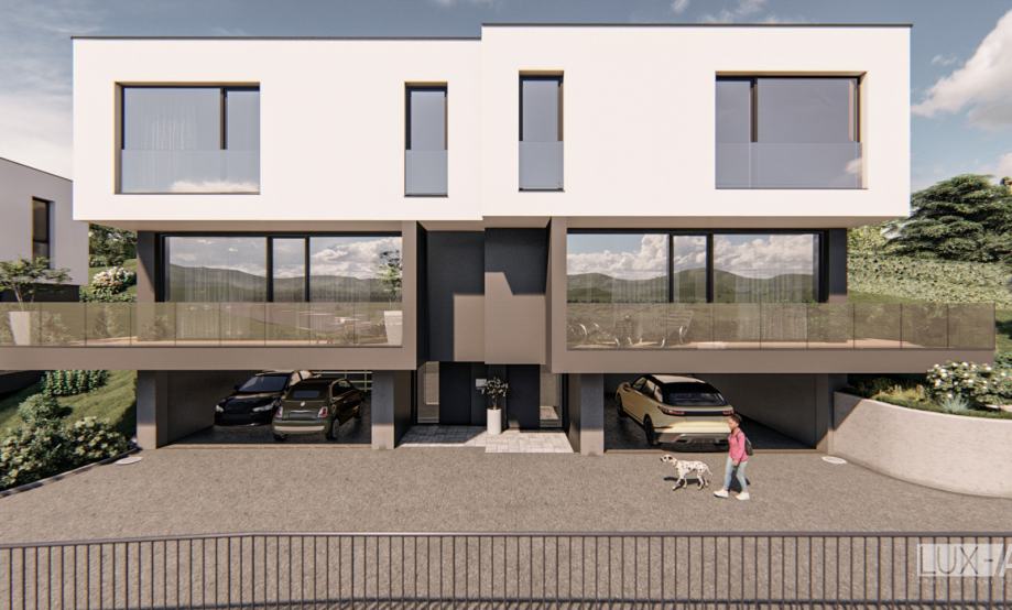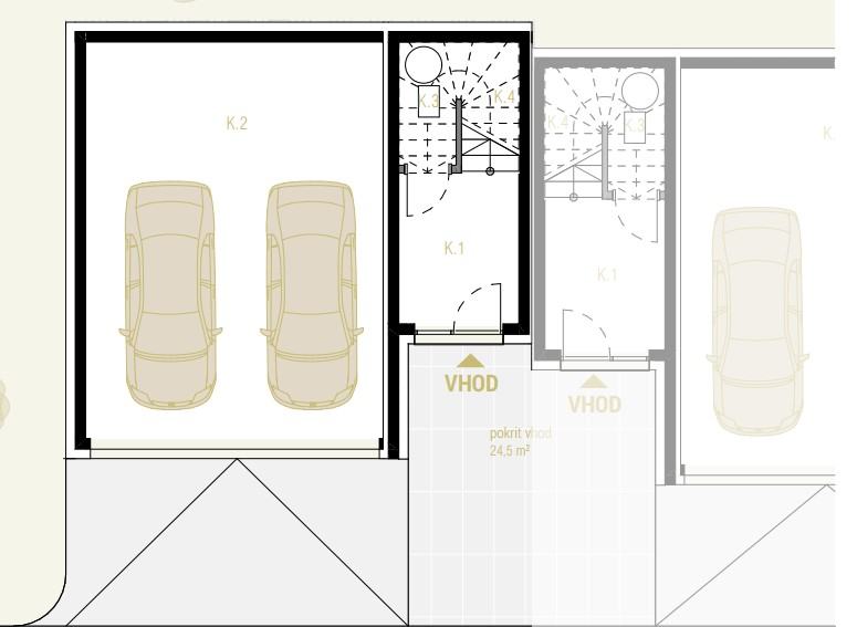 V kletni etaži so vhodni del, garaža za dva avtomobila ter tehnični prostor.
