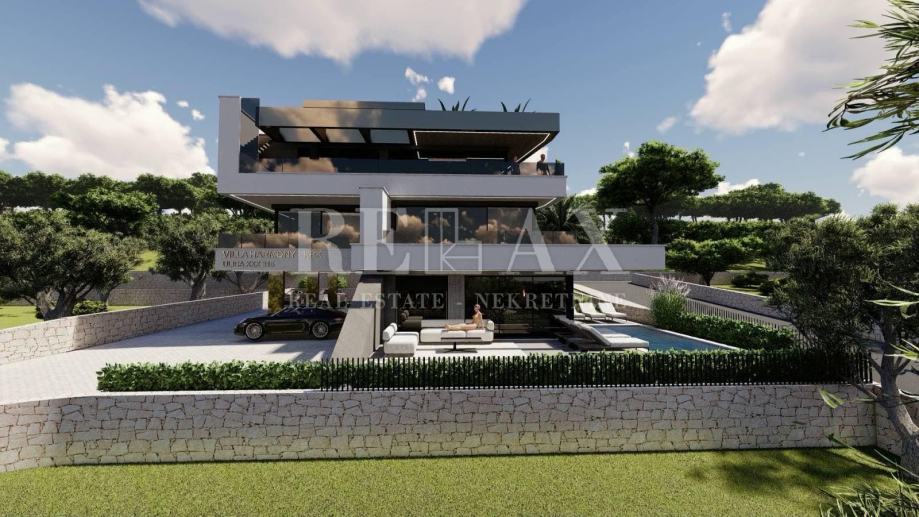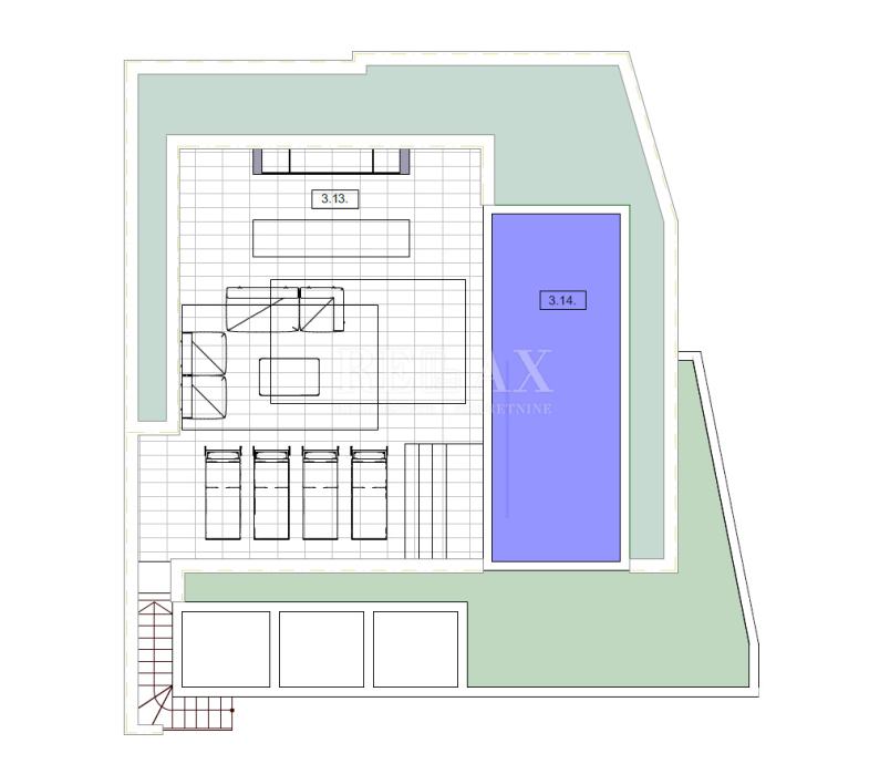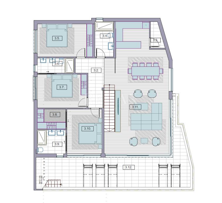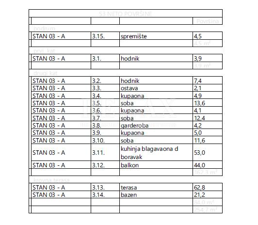166,2 m2 veliko stanovanje se nahaja v drugem nadstropju in obsega glavno spalnico z garderobno omaro in lastno kopalnico, hodnik, dve spalnici, dve kopalnici, shrambo, veliko odprto kuhinjo z jedilnico ter dnevno sobo z izhodom na velik balkon s čudovitim razgledom in od koder vodijo stopnice na strešno teraso 84 m2 z bazenom in sončno teraso, ki ji je možno po želji dodati še kakšno drugo vsebino.
