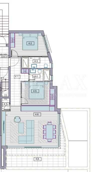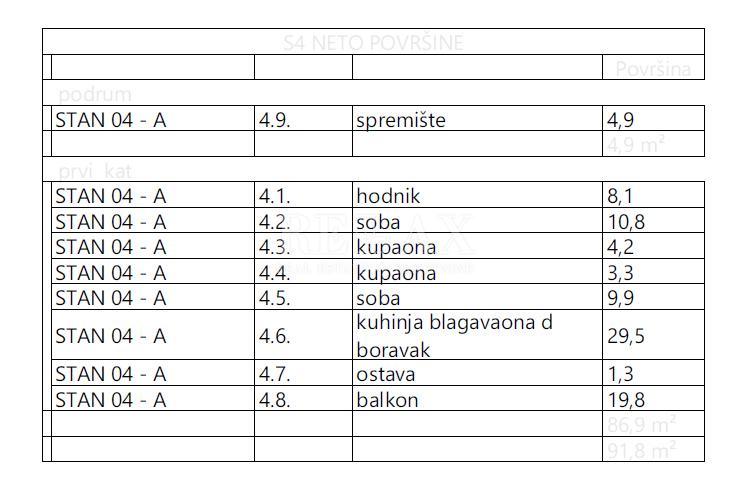 V stanovanju velikosti 86,9 m2 se nahaja velika glavna spalnica z lastno kopalnico, še ena spalnica, hodnik, shramba, kopalnica, odprta kuhinja z jedilnico in dnevna soba z izhodom na balkon 19,8 m2 s čudovitim razgledom.