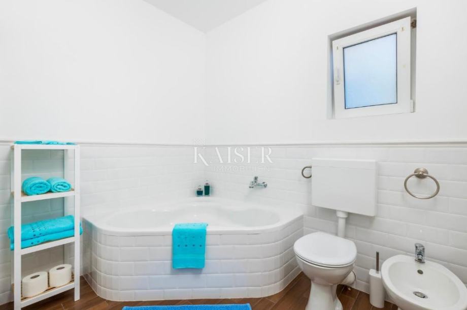 Ponujamo vam čudovito, elegantno opremljeno stanovanje velikosti 135 m², ki se nahaja v pritličju hiše s štirimi enotami, na mirni lokaciji, obdani z zelenjem. Stanovanje izžareva prefinjen slog in toplino doma - svetla dnevna soba z rustikalnim kamnitim kaminom in skrbno izbranimi detajli ustvarja vzdušje ekskluzivne poletne rezidence ali mirne družinske hiše. Stanovanje ima lasten vhod in je sestavljeno iz dveh udobnih spalnic, dveh kopalnic, prostorne dnevne sobe, elegantne kuhinje z jedilnico, lože, velike terase s čudovitim pogledom na morje in praktične shrambe/pralnice. Je popolnoma opremljeno, klimatizirano, z električnimi radiatorji in centralnim ogrevanjem preko skupne kotlovnice. Parkirno mesto je zagotovljeno na ograjenem dvorišču tik pred vhodom, skupna shramba pa zagotavlja dodatno vrednost. Oddaljenost od morja je 1 km zračne črte, avtobusna postaja je 300 m, v neposredni bližini pa se nahajajo vse ugodnosti, plaže, marina Ičići in Opatija (3–6 km). LOKACIJA: Lovran je očarljivo obalno mesto, ki se nahaja na vzhodnih pobočjih Učke, v osrčju Kvarnerja, le nekaj kilometrov južno od Opatije. Znano je po svoji dolgi zgodovini, mediteranskem duhu in bogati arhitekturni dediščini, pa tudi po izjemni naravni lepoti. Staro mestno jedro z ozkimi ulicami in kamnitimi hišami izžareva pristno vzdušje, medtem ko promenada Lungomare povezuje Lovran z Opatijo in ponuja nepozabne razglede na morje in okoliške otoke. Lovran ponuja mirnejši in sproščenejši življenjski slog, a tudi vse potrebne ugodnosti za prijetno bivanje skozi vse leto - trgovine, restavracije, kavarne, plaže, pristanišče in odlične prometne povezave. Je idealna destinacija za tiste, ki iščejo ravnovesje med bližino mesta in naravnega okolja, bodisi za stalno prebivališče, počitnice ali naložbo v turizem. Bližina ugodnosti: Restavracija - 2 km Kavarna - 1,5 km Trgovina - 2 km Marina - 3,1 km Opatija - 6 km Reka - 22 km Agencijska provizija za kupca znaša 3 % + DDV in se plača v primeru nakupa nepremičnine, ob sklenitvi prvega pravnega dejanja. Zainteresirani kupci si lahko ogledajo nepremičnino šele po podpisu pogodbe o posredovanju v prometu z nepremičninami. Za dodatne informacije me kontaktirajte na 00385 976839504 ali na e-naslovu: ilijana@kaiser-immobilien.hr