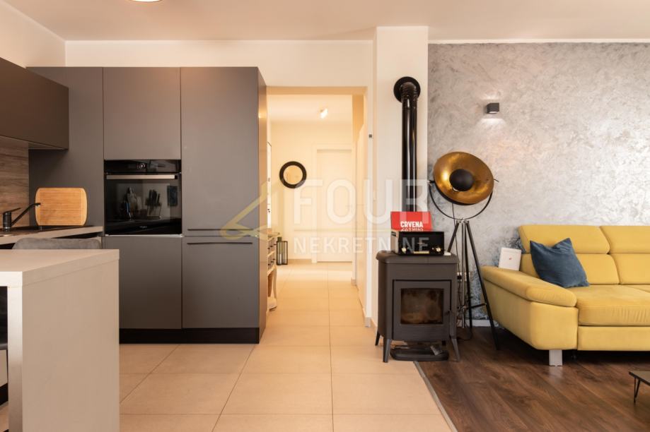 Na prodaj je prostorno in funkcionalno urejeno stanovanje s skupno neto površino 84,13 m², ki se nahaja v pritličju manjše stanovanjske stavbe v mirnem in urejenem delu Marčelj. Stanovanje obsega hodnik, dve udobni spalnici, kopalnico s talnim gretjem, kuhinjo povezano z jedilnico in dnevno sobo ter izhod na balkon in pokrito teraso z navpičnimi tendami, ki zagotavljajo dodatno zasebnost in zaščito pred soncem. V dnevni sobi je peč na drva, ki pričara prijetno vzdušje v zimskih mesecih, vgrajena pa je tudi inverterska klima za celoletno udobje.