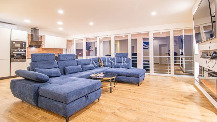 V bližini mesta Opatija in mesta Matulji, na lepo vzdrževanem in definiranem vrtu na sončni legi, Kaiser-immobilie ponuja čudovito, na novo prenovljeno stanovanje velikosti 100 m2 bivalne površine s tremi parkirnimi mesti na vrtu stanovanjske stavbe, ki jo sestavljajo klet, pritličje in prvo nadstropje. V stanovanje se vstopi iz majhne dvorane, stopnice pa vodijo v odprt prostor, kjer se nahajajo kuhinja, jedilnica in dnevna soba s čudovitim električnim kaminom z močjo 7 kW, ki poleg estetske in vizualne izkušnje zagotavlja tudi lepo količino toplotne energije za celoten prostor. Južna stran prostora je po celotni dolžini odprta proti čudovitemu razgledu na morje s stekleno steno, ki v lepem sončnem vremenu zagotavlja udobje in toplino v prostoru. Poleg tega imamo talno ogrevanje po celotnem nadstropju in klimatsko napravo. Iz dnevne sobe vstopimo v prostor dveh spalnic, orientiranih na severozahodno stran nadstropja. Na voljo je tudi manjša shramba in kopalnica s tušem, kar ustvarja lep in funkcionalen ambient stanovanja. Iz dnevne sobe in kuhinje izhodimo na balkon po celotni dolžini južne strani stanovanja, s katerega nas bo očaral razgled na Reko z nočnimi lučkami kot tudi pogled proti morju. Stanovanje je opremljeno z vrhunsko tehnologijo in udobnim prostornim lepim novim pohištvom ter se kot takšno tudi ponuja. Za vse informacije pokličite +385916133776 agenta Eli Lovko