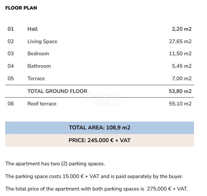 Kaiser Immobilien vam predstavlja čudovito in privlačno stanovanje na mirni lokaciji v bližini Novigrada. Apartma je oddaljen 300 m od morja, 400 m od lepo urejene plaže in 5 km od centra Novigrada. Stanovanje ima 55 m2 in se nahaja v 1. nadstropju stavbe, ki jo sestavljajo skupno 3 stanovanja. Stanovanje obsega vhodno dvorano, kopalnico, spalnico in odprt prostor s kuhinjo z jedilnico in dnevno sobo z izhodom na teraso. Stanovanje ima čudovito strešno teraso velikosti 55 m2 s čudovitim pogledom na morje. Stanovanje se lahko uporablja za stanovanjske ali turistične namene. Stanovanju pripadata 2 parkirni mesti. TEHNIČNI OPIS KONSTRUKCIJE Temelji stavbe so zgrajeni na globini pod lediščem, tj. najmanj 60 cm od tal. Dimenzije temelja so 50x60 cm. -Nosilne stene so iz opeke in delno armiranega betona, delno ometane, delno pa obložene s kamnito oblogo debeline d= 5 cm. Na zunanjih stenah je nameščena toplotna izolacija debeline d=8 cm. - Stebri, nosilci, cerklaže in preklade iz armiranega betona po statičnem izračunu C25/30. Na vse nosilne stene je treba namestiti vodoravne armaturne palice širine stene in višine d= 20 cm, armirane po statičnem izračunu. -Streha in medetažne plošče so iz armiranega betona. -Streha je ravna in pohodna. Streha je izdelana iz PVC folije; da ga je kasneje mogoče namestiti s "keramičnimi ploščicami" in ga uporabiti kot strešno teraso. OBDELAVA STEN - Notranje stene so iz opeke. - Grobo in fino ometajte notranje stene, - Vse stene in strope premažite z belo barvo. -Stene v kopalnicah in straniščih so obložene s keramiko, delno ometane in pobarvane belo. -Fasada stavbe je delno obložena s kamnom d=5 cm, QUICK LARGE 21230 temno bež barve in delno z zaključnim slojem. TLA - Na tla je vgrajena keramika višje kakovosti. Na mestih, kjer obstaja možnost vode (kopalnice), se pod keramiko namesti hidroizolacijski premaz. TESARSTVO - Gradbeno mizarstvo je izdelano iz ALU materiala s troslojnim steklom, barvanim v izbrani RAL barvi. -Lesena vrata na teraso so izdelana iz ALU materiala (ALU-K profil), barvanega v izbrani RAL barvi. - Notranja vrata so bela. - Vhodna vrata so izdelana iz ALU materiala, - Alu žaluzije barvane v izbrani RAL barvi z električnim pogonom. MONTAŽA Stavba bo priključena na obstoječe električno, vodovodno in kanalizacijsko omrežje. ELEKTRIČNE INSTALACIJE Električne inštalacije: -nizkonapetostni priključek stavbe -inštalacije glavnega razvoda in merjenja porabe električne energije -električne inštalacije porabnikov -električne inštalacije razsvetljave in vtičnic -električne inštalacije z inštalacijami za prezračevanje, ogrevanje in klimatizacijo -inštalacije za izenačitev potencialov in dodatne inštalacije za izenačitev potencialov -inštalacije zaščitne ozemljitve Slabotokovne inštalacije: -telefonske inštalacije -antenske inštalacije INSTALACIJA GREVANJA IN HLAJENJA Vsaka stanovanjska enota ima inštalacijo za talno ogrevanje - pripravljeno, da stranka sama vgradi vrsto talnega ogrevanja, ki si jo želi. Vsaka stanovanjska enota ima svoj neodvisen sistem ogrevanja in hlajenja. Hlajenje z deljenim klimatskim sistemom. Kot vir energije bo uporabljena samo elektrika. PRIPRAVA SANITARNE TOPLE VODE Sanitarna topla voda se pripravlja v kotlu z električnim grelnikom. OKOLJE IN PARKIRIŠČE Hiša ima na meji ograjo. Ograja je iz armiranega betona. Parkirišče je pred stavbo, dostop z glavne ceste. Parkirišča so na zelenem območju. Kupnina vključuje DDV, zato kupcem ni treba plačati davka na promet nepremičnin. Provizija agencije za kupca znaša 3 % + DDV. Provizija krije vse storitve, povezane z nakupom, in se izplača ob sklenitvi prvega pravnega dejanja. Za vse dodatne informacije o tem in drugih apartmajih v ponudbi smo vam na voljo. Damir Mlacović damir@kaiser-immobilien.hr http://kaiser-immobilien.hr/ +385-98-339-933