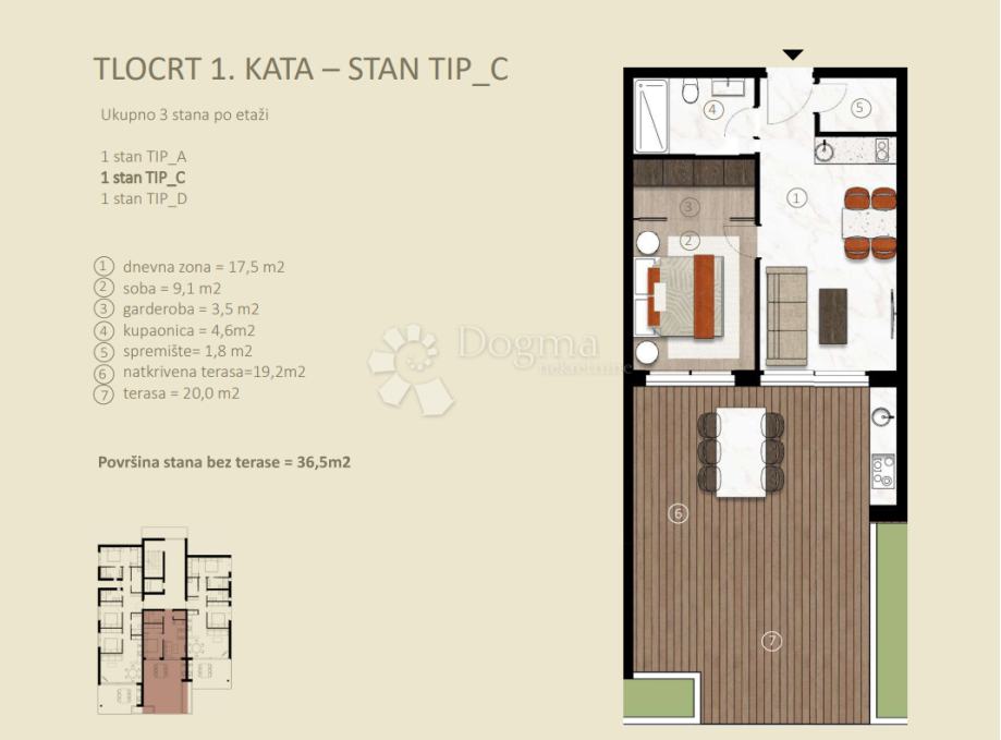 Površina stanovanja brez terase: 36,50 m²