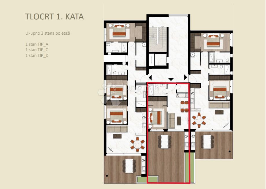 Stanovanja bodo eno-, dvo- in trisobna, opremljena z 1, 2 ali 3 kopalnicami, z odlično razporeditvijo in odlično komunikacijo med prostori.