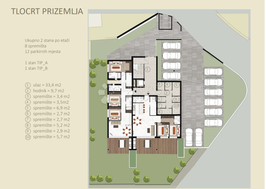 Parkirni prostor za vaša vozila je zagotovljen z 18 pokritimi parkirnimi mesti, ter shrambo za vsako stanovanje v ponudbi.