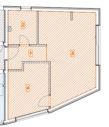 - *Predsoba, prostorna dnevna soba s kuhinjo in jedilnico, dve spalnici, kopalnica, shramba*