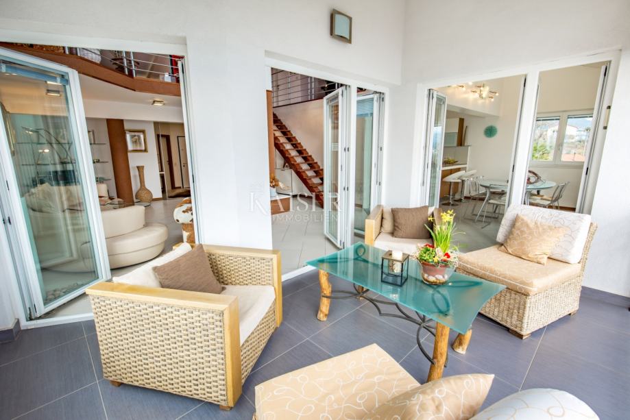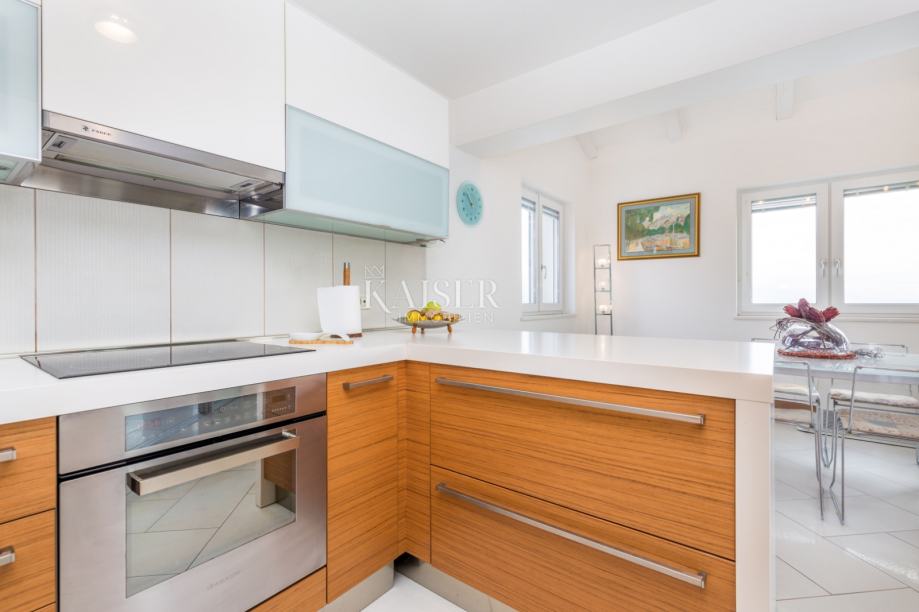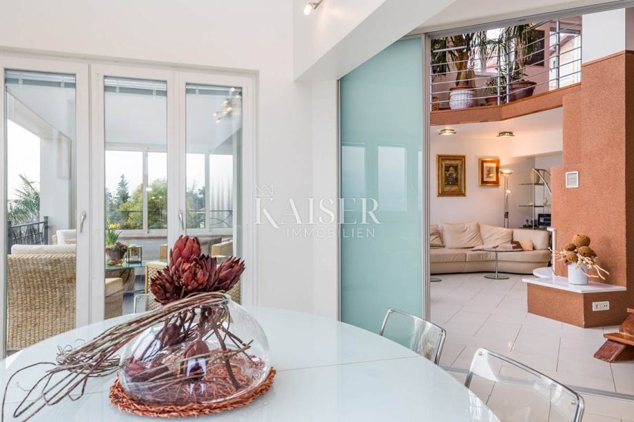 Kaiser Immobilien iz svoje ponudbe izpostavlja luksuzno stanovanje s čudovitim pogledom na Kvarner v Opatiji. Nadstropje ima ločen vhod obdan z zelenico in teraso 180 m2. Dvonadstropna nepremičnina je sestavljena iz treh spalnic, vsaka z izhodom na balkon, dnevne sobe s kaminom in teraso, kuhinje z balkonom in treh kopalnic. Ob vhodu v nadstropje je še en prostor z WC-jem in pralnico. V prvem nadstropju je spa in fitnes center ter dnevna soba z izhodom na teraso s čudovitim panoramskim razgledom. Na vrtu se nahaja še ena letna kuhinja s teraso 80 m2, žarom in bazenom. Nadstropje se nahaja le 50 metrov od morja in drugih vsebin, trgovin, klubov in restavracij.Ta čudovita nepremičnina je opremljena z vsemi kakovostnimi in modernimi aparati, na vrtu pa sta tudi dve parkirni mesti. Nepremičnina je pravi biser in bo zadovoljila vsakega kupca. Priporočamo. Za podrobnejše informacije se obrnite na svojega agenta.