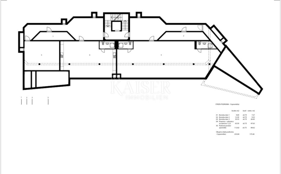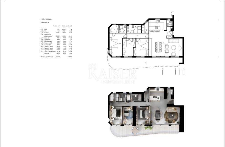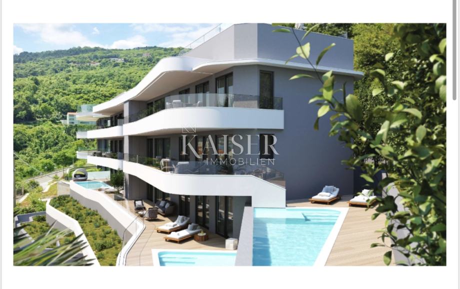 Kaiser Immobilien predstavlja moderno stanovanje v novi stavbi na mirni lokaciji v bližini morja v Opatiji. Stanovanje ima površino 158 m2 in je sestavljeno iz predsobe (3,24 m2), dnevne sobe z jedilnico (39,95 m2), manjše stranišče (1,65 m2), hodnika (5,51 m2), shrambe. soba ( 3,53 m2), glavna spalnica z lastno kopalnico in garderobo. (16,76 m2, 5,33 m2 in 3,65 m2). Poleg tega imamo še dve spalnici (11,38 m2 in 13,45 m2) in eno kopalnico (3,04 m2). Stanovanju pripada tudi pokrita terasa 20 m2 in tri parkirna mesta v garaži. Ogrevanje je talno s toplotnimi črpalkami. Apartma ponuja pogled na morje. Vsi pomembni objekti se nahajajo v bližini same nepremičnine, medtem ko je morje oddaljeno le 100 metrov zračne črte. Objekt je v gradnji, pri sami gradnji pa bodo uporabljeni le najkvalitetnejši materiali. Zaključek del je predviden konec leta 2023.