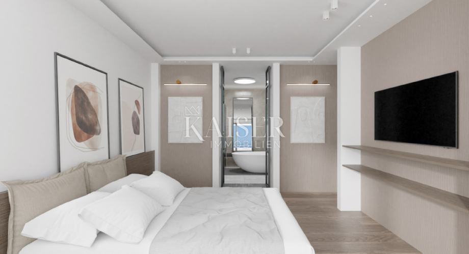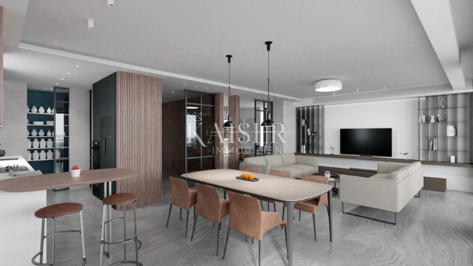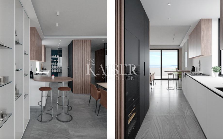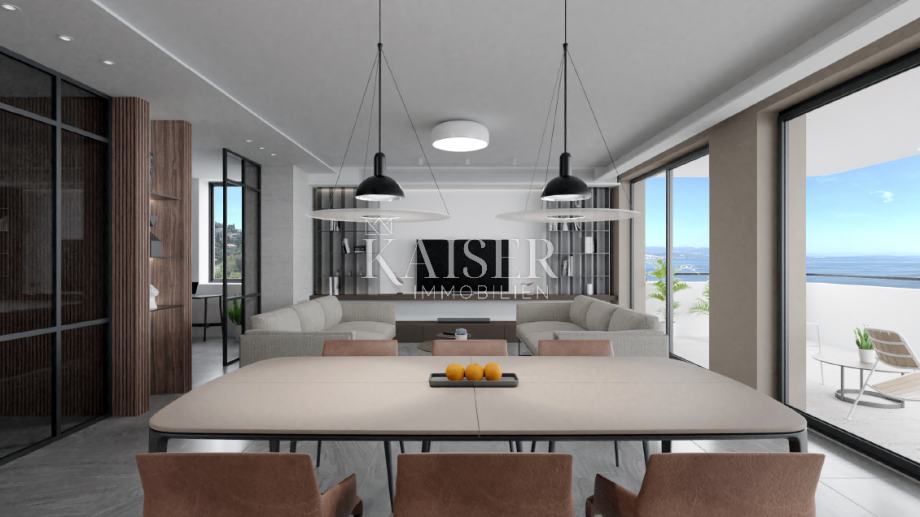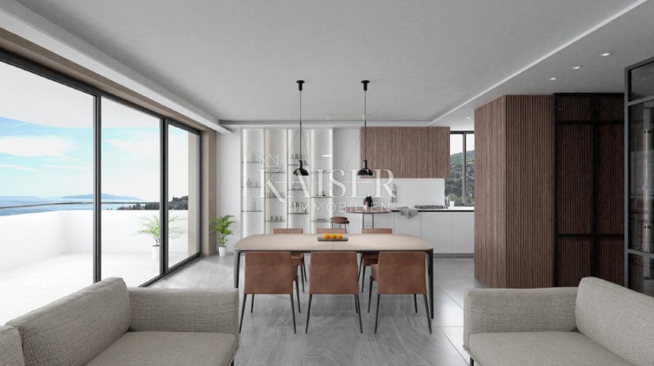 Agencija Kaiser Immobilien iz svoje ponudbe izpostavlja luksuzno novogradnjo neposredno nad centrom Opatije s fantastičnim pogledom na celoten Kvarnerski zaliv. V naravi gre za dvoetažno stanovanje, ki obsega atrij, 2 hodnika, garderobo, 3 spalnice, 3 kopalnice, 2 wc-ja, delovno sobo, kuhinjo z jedilnico, veliko dnevno sobo, 2 terasi na 2. nadstropje, kopalnica v mansardi ter 2 terasi in bazen na strehi skupne uporabne površine 365,60 m2. Stanovanju pripadata tudi 2 shrambi v pritličju stavbe, 2 garažni parkirni mesti v kleti stavbe in 2 zunanji parkirni mesti na dvorišču stavbe. Objekt se nahaja na mirni lokaciji v neposredni bližini vseh objektov, 500 metrov zračne črte od obale in 700 metrov od centra Opatije. Navedena cena ne vsebuje 25% DDV.
