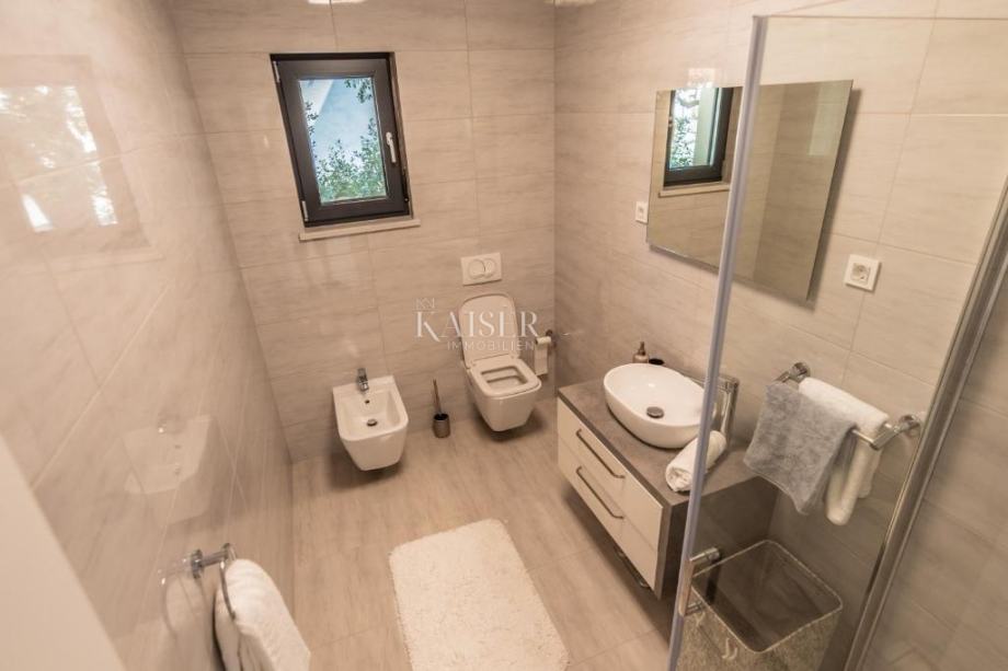 V zaledju Opatije se nahaja čudovit trinadstropni apartma s pogledom na opatijsko riviero in otoke z zunanjim bazenom na vrhu stavbe, ki jo sestavljata dva luksuzna apartmaja. Kaiser Immobilien daje na trg luksuzno stanovanje jugovzhodne orientacije in bivalne površine 240 m2, ki je sestavljeno iz kleti, pritličja, pritličja in nadstropja. V kleti hiše je kurilnica. Glavni vhod v ekskluzivno stanovanje nas pripelje v visoko pritličje, kjer vstopimo v odprt predprostor, povezan s kuhinjo, jedilnico in veliko dnevno sobo, ter veliko teraso z odprtim pogledom za popoldansko ohladitev, 1 spalnico s pripadajočo kopalnico in garderobno omaro sestavljajo celotno to nadstropje. Po notranjem stopnišču se lahko spustimo v pritličje ali povzpnemo v 1. nadstropje. V pritličju sta 2 spalnici, vsaka s svojo kopalnico in veliko teraso, velik prostor za domačo telovadnico ali otroško igralnico ter shramba s pralnim strojem. V 1. nadstropju je glavna spalnica z lastno kopalnico in čudovito teraso z bazenom ter fantastičnim pogledom na morje, Reko in celoten Kvarnerski zaliv. Ta terasa je povezana z drugo veliko teraso, ki se nahaja na nasprotni severozahodni strani hiše in nudi lastnikom prijetno senco v vročih dneh ter čudovit pogled na Učko in sončne zahode. Hiša je zgrajena iz kvalitetnih materialov in ima premišljeno notranjo razporeditev. V ospredju so skupni prostori, pametno urejene spalnice pa lastnikom zagotavljajo maksimalen mir in zasebnost. Po celotni hiši je nameščeno električno talno ogrevanje in klimatske naprave za hlajenje in ogrevanje. Okoli hiše so na voljo vsaj 4 parkirna mesta. Dvorišče apartmaja ima površino 285 m2 in pred hišo s pogledom na morje je majhen vrt s sredozemskimi rastlinami in citrusi. Lokacija je 5 minut vožnje z avtomobilom od centra Opatije, kot tudi od vseh pomembnih vsebin, trgovin, ambulant, lekarn, avtobusnih postaj, šol. Peš bližnjica do morja je dosegljiva v desetih minutah. Večja mesta, kot je Zagreb, so oddaljena približno 1.30 minut vožnje z avtomobilom, Ljubljana približno 1.30 minut, Poreč približno 1 uro, letališče Krk približno 40 minut, Rijeka približno 20 minut. Za dodatne informacije in ogled kontaktirajte vašega agenta: Eli Lovko, mob: 0916133776; eli@kaiser-immobilien.hr Agencijska provizija znaša 3% + DDV
