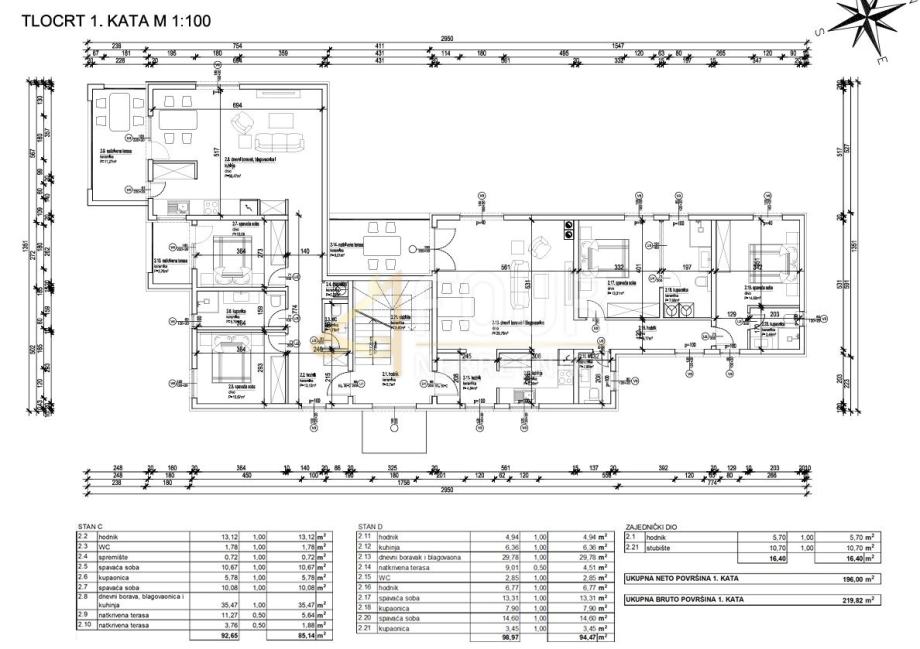 Stanovanje ima površino 98,97 m² in obsega hodnik, kuhinjo, dnevno sobo z jedilnico, pokrito teraso (9,01 m²), hodnik, toaleto, dve spalnici in dve kopalnici.