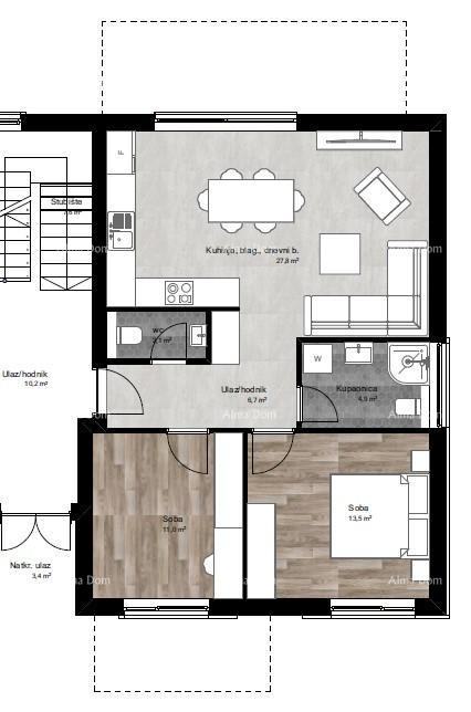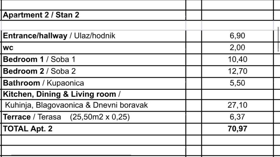 Stanovanje obsega predsobo, dnevno sobo + kuhinjo + jedilnico, 2 spalnici, kopalnico, WC in teraso.