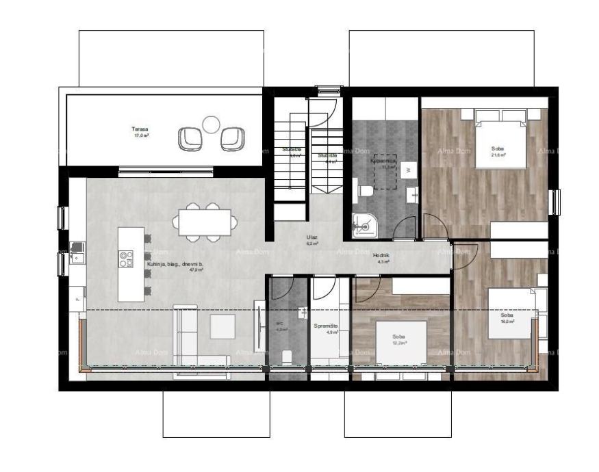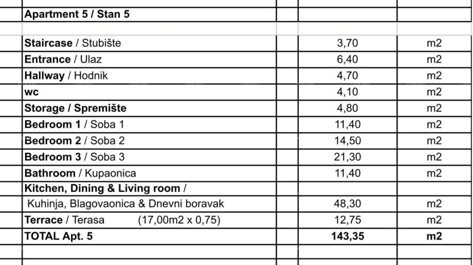 Stanovanje obsega predsobo, hodnik, dnevno sobo + kuhinjo + jedilnico, 3 spalnice, kopalnico, WC, shrambo in teraso.
