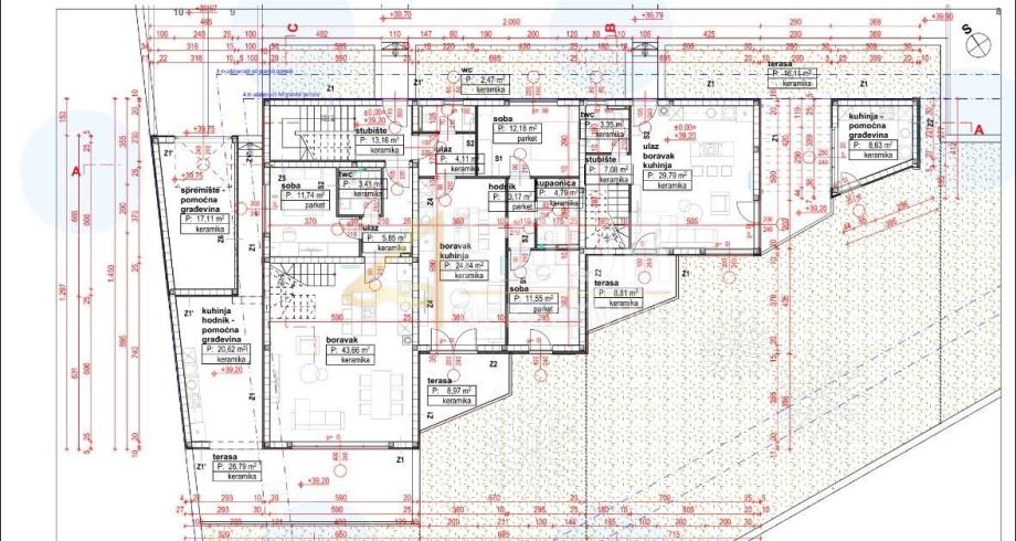 V prvi etaži se nahajajo dnevna soba s kuhinjo in jedilnico v odprtem prostoru, ki vodi na teraso in letno kuhinjo (skupna površina zunanjega prostora je 47,41 m2), WC in spalnica/delovna soba.