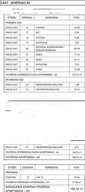 Prostorno stanovanje velikosti 138,76 m2 obsega predprostor, glavno spalnico z lastno kopalnico, shrambo, stranišče, dve spalnici, kopalnico, veliko odprto kuhinjo z jedilnico in dnevno sobo z dostopom do pokrit balkon z impresivnim pogledom na morje.