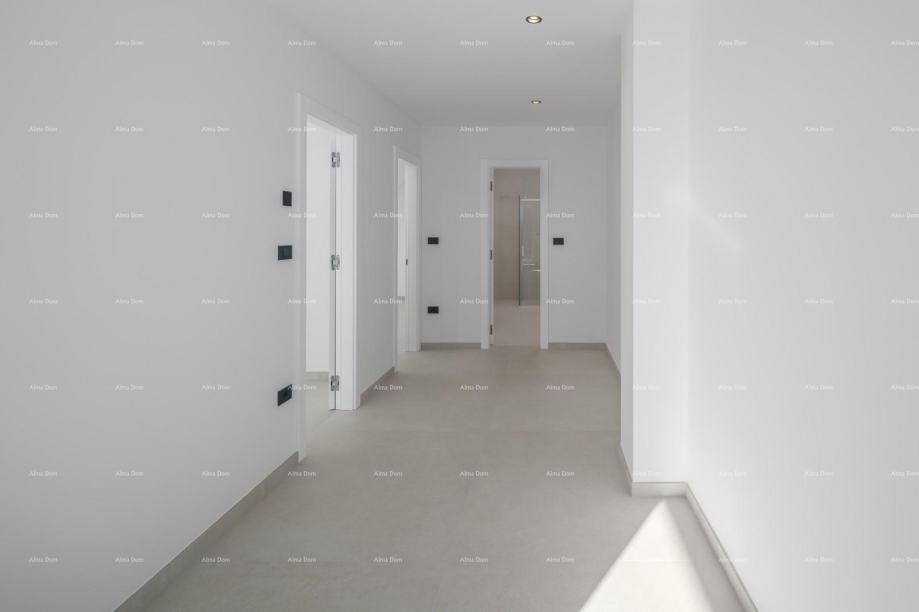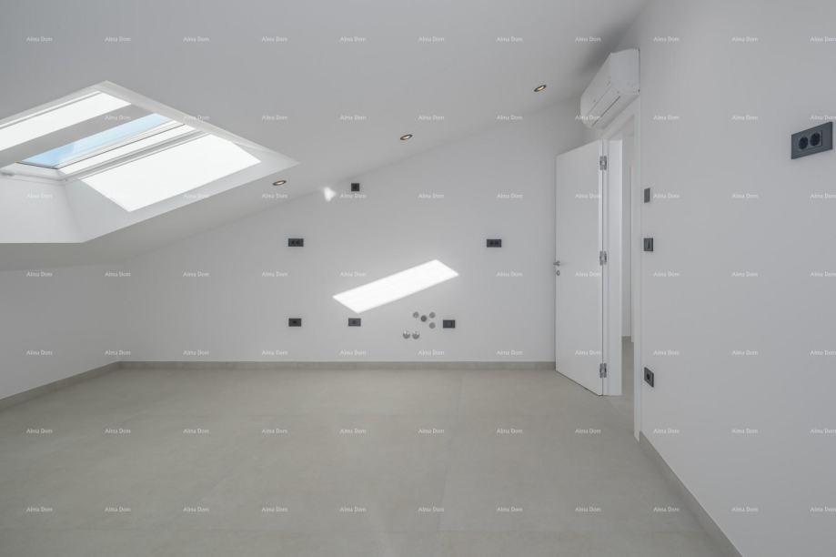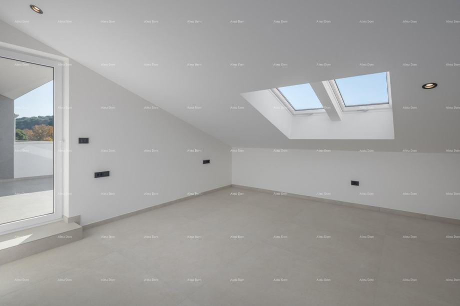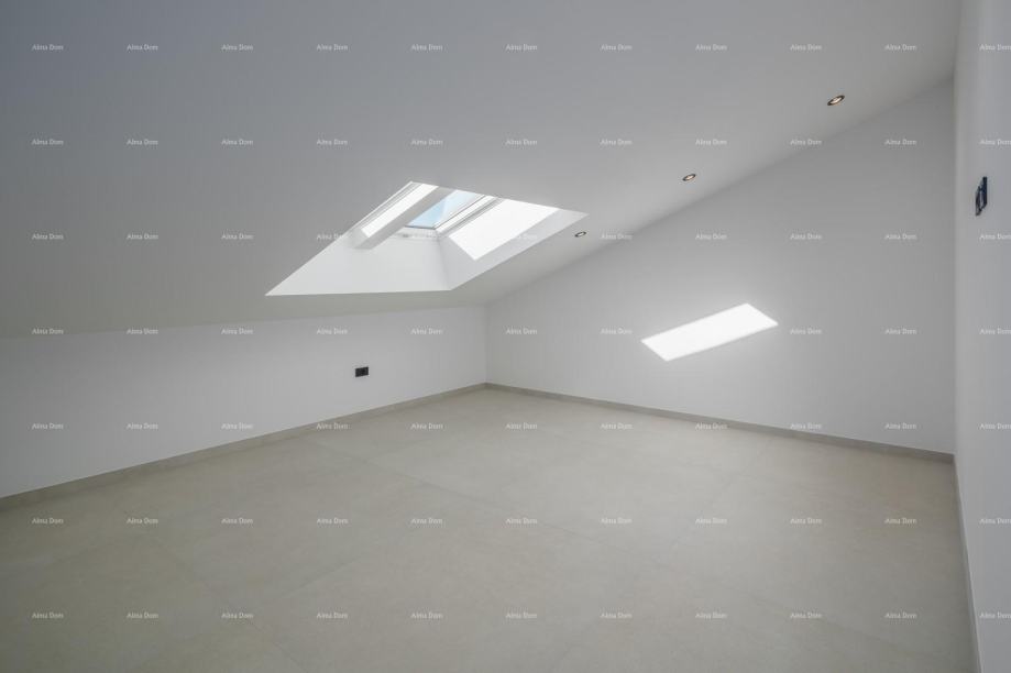 Notranje stopnice vodijo v drugo nadstropje, kjer sta še dve spalnici, kopalnica in velika strešna terasa s pogledom na morje in Rovinj.