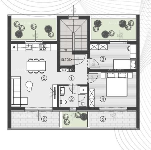 Stan z oznako 7D se nahaja v 2. nadstropju zgradbe in obsega: hodnik, dnevno sobo s kuhinjo in jedilnico, 2 spalnici, kopalnico in teraso.