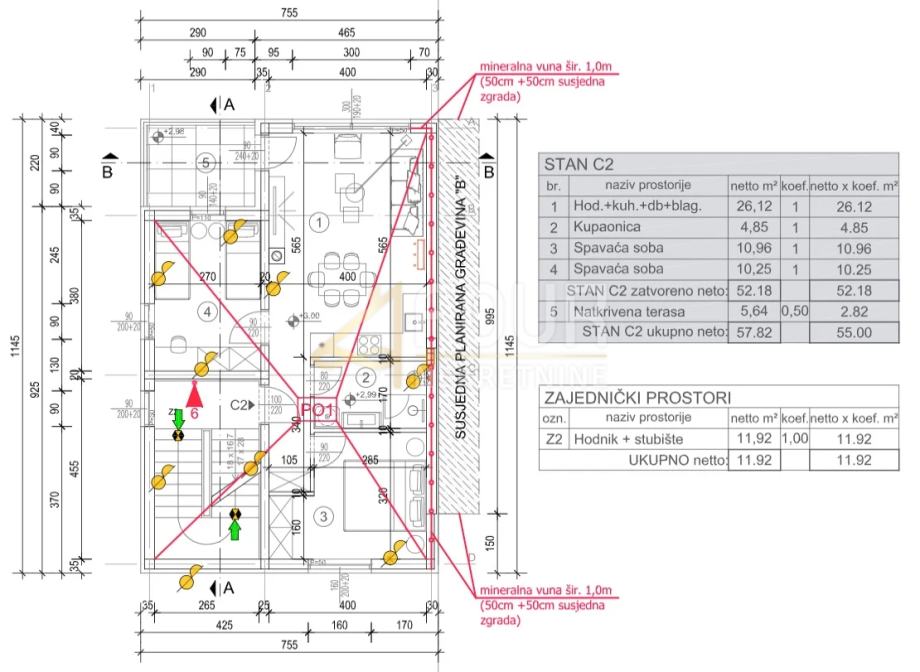 Stanovanje obsega dve spalnici, dnevni prostor s kuhinjo in jedilnico v odprtem konceptu, kopalnico in pokrito teraso.
