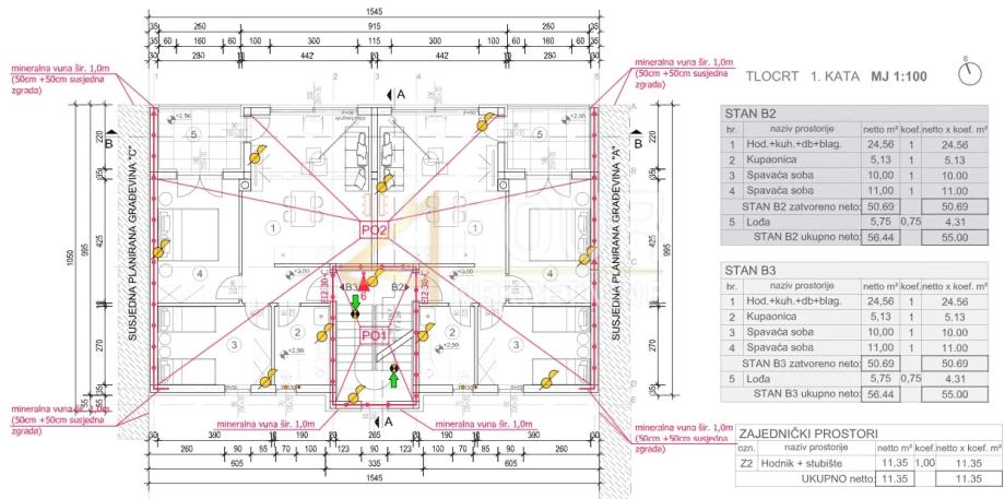 Stanovanje obsega dve spalnici, dnevni prostor s kuhinjo in jedilnico v odprtem konceptu, kopalnico in ložo.