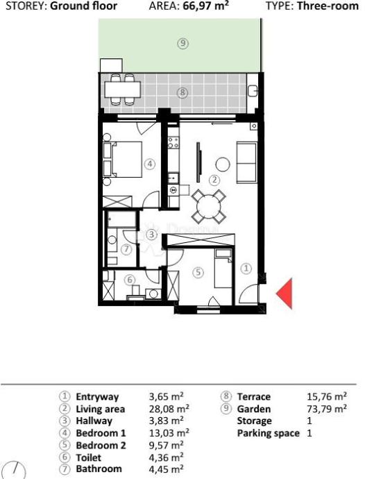 Stanovanje ima neto uporabno površino 66,97 m² in dodatno teraso velikosti 89,55 m² — idealno za jutranjo kavo ali večerno sproščanje.