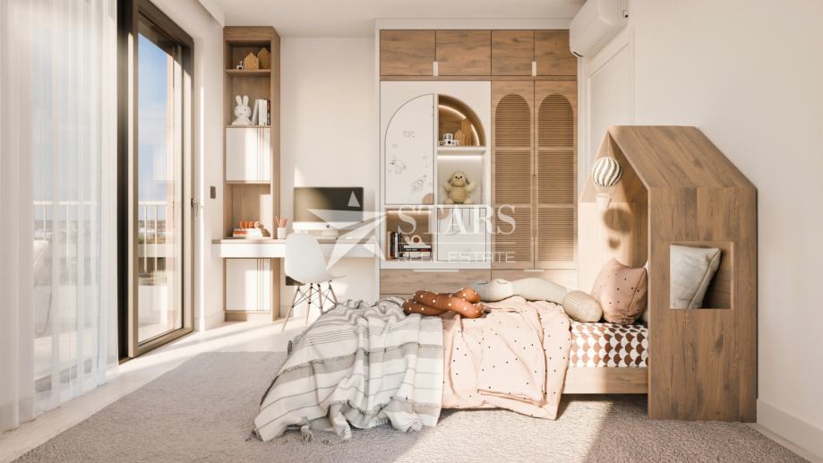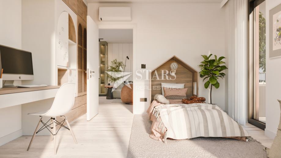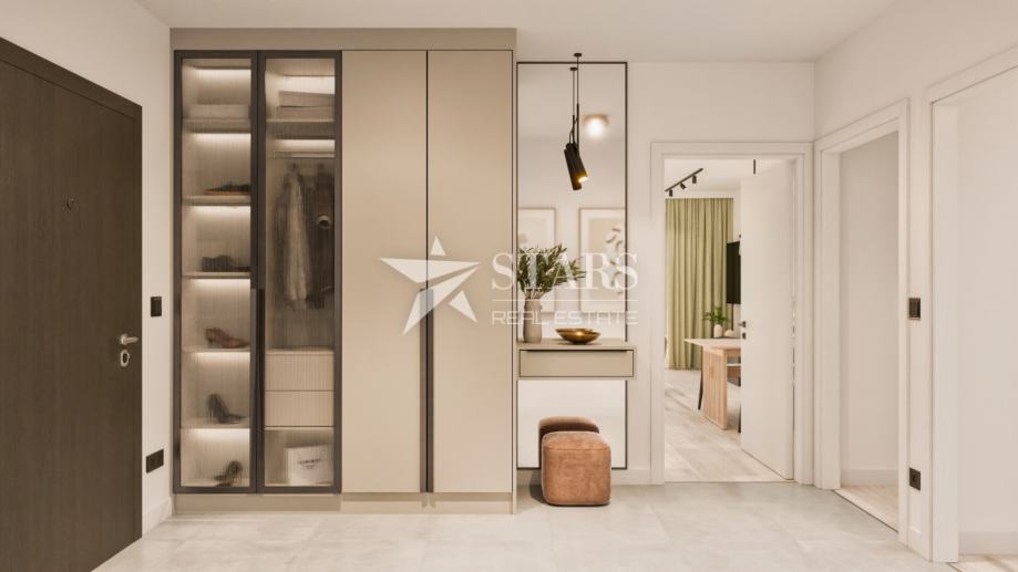 Razporeditev vključuje tri spalnice, dve kopalnici, ločeno kuhinjo ter dnevni prostor z izhodom na prostorno teraso. Zaključna obdelava vključuje hrastov parket, velikoformatno keramiko, multisplit klimatski sistem, električne rolete in protivlomna vrata.