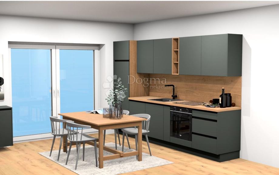 Opremljenost: kuhinja po meri z vsemi aparati, kopalnica s kvalitetno keramiko in sanitarno keramiko ter kopalniškim pohištvom, hrastov parket, kvalitetno mizarstvo, možnost opremljanja celotnega stanovanja s pohištvom (z doplačilom).