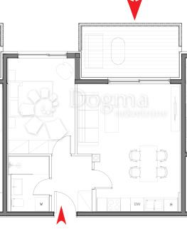 Sestoji iz predsobe, kopalnice, prostorne dnevne sobe s kuhinjo in jedilnico ter spalnice.